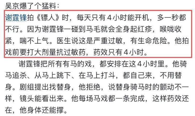 这倒不是因为他身体素质不行,打不动吴京,其实是因为谢霆锋对马毛过敏。