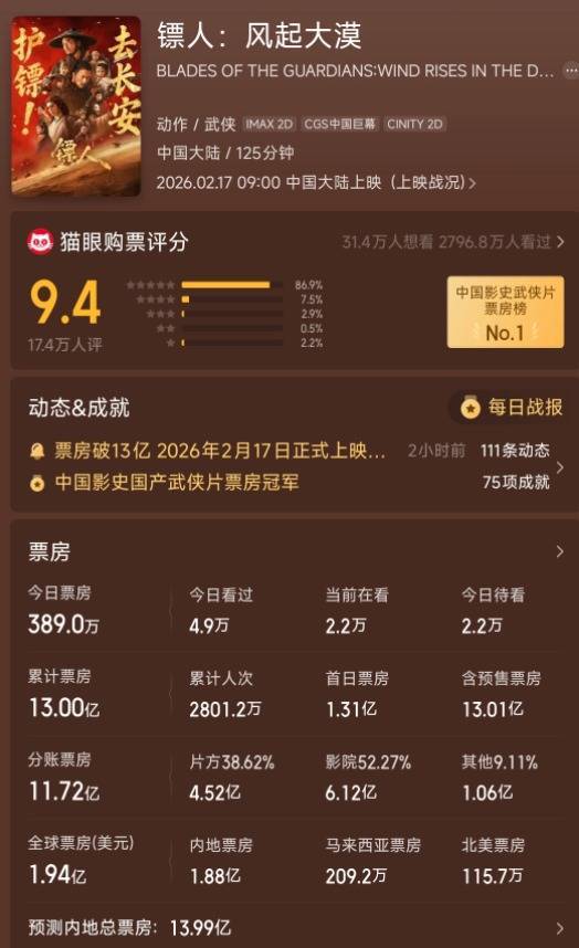 截至目前,该片累计票房已经突亿,超越《射雕英雄传:侠之大者》成为中国影史武侠片票房冠军。